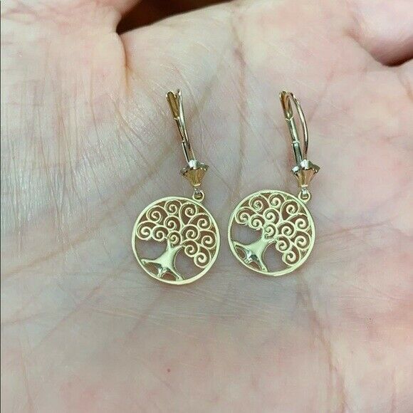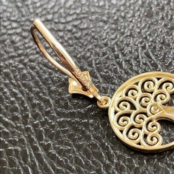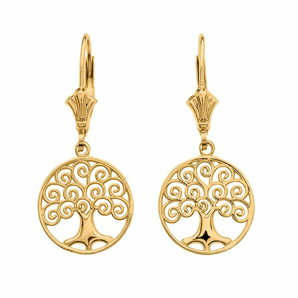 10K Solid Yellow Gold Tree of Life Openwork Drop / Dangle Leverback Earrings
