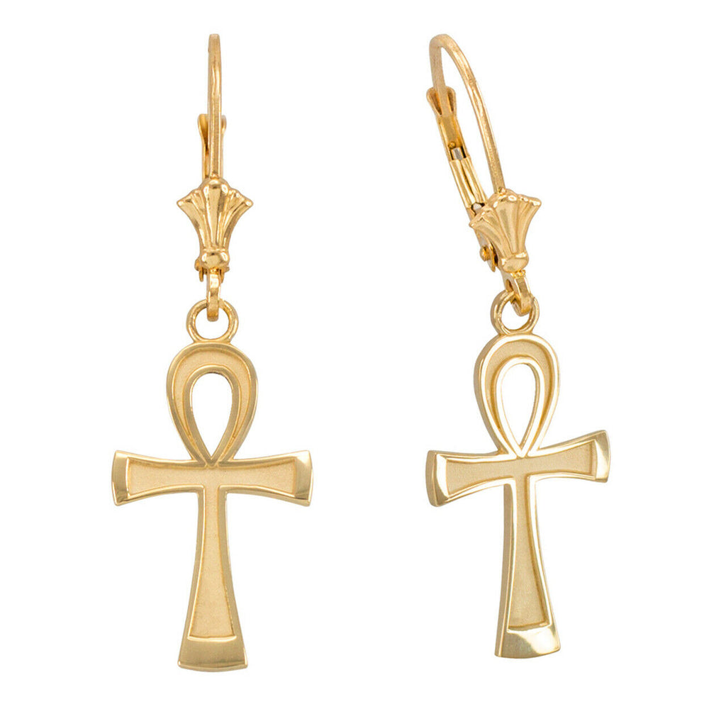 10K Yellow Gold Ancient Egyptian Ankh Cross Drop/Dangle Leverback Earrings |