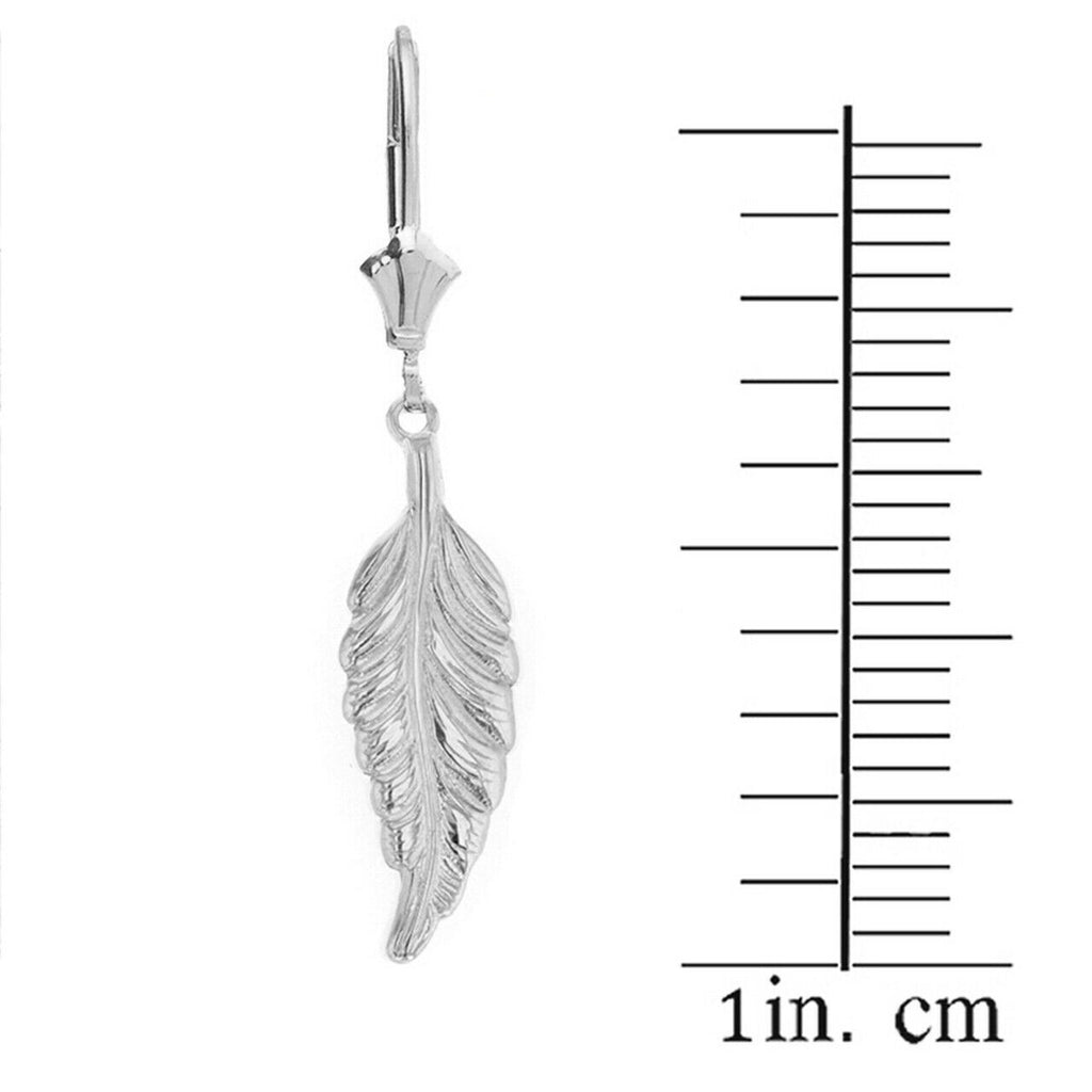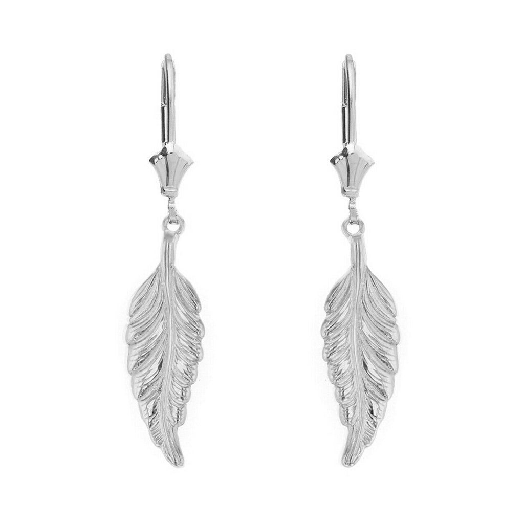 Solid 14k or 10k White Gold Bohemia Boho Feather Leverback Drop Earrings Set