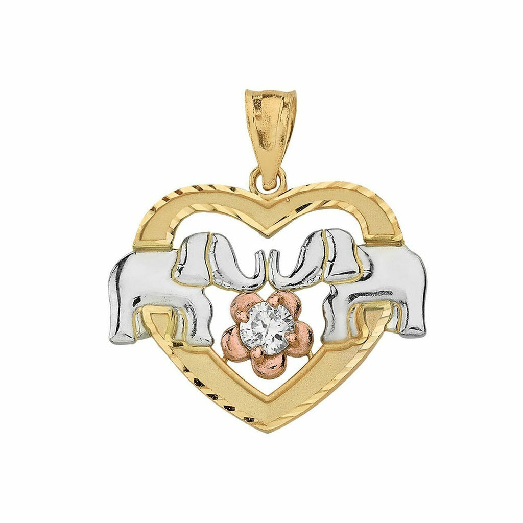 Fine 10k Solid Three Tone Gold Elephant and Heart CZ Pendant Necklace