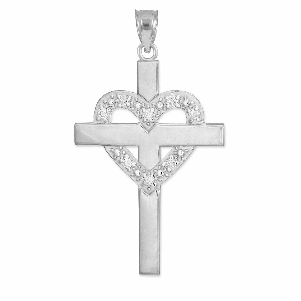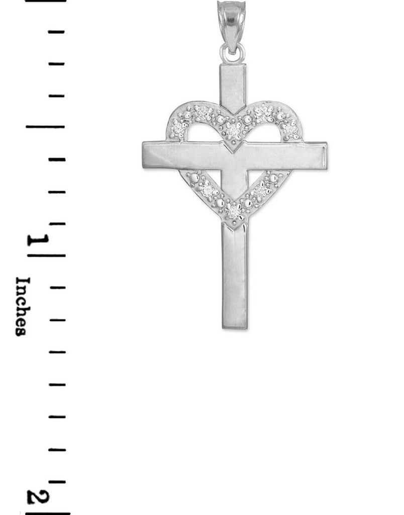 Solid 10k White Gold Cross 0.08 CTW Diamond Heart Pendant Necklace |