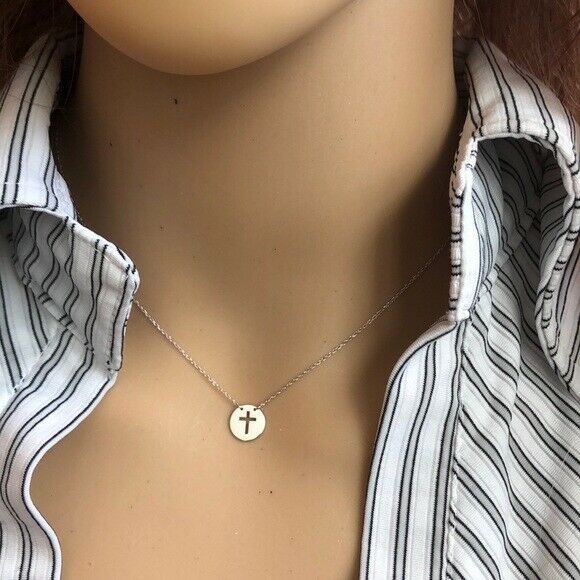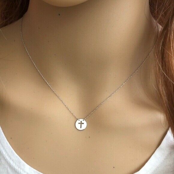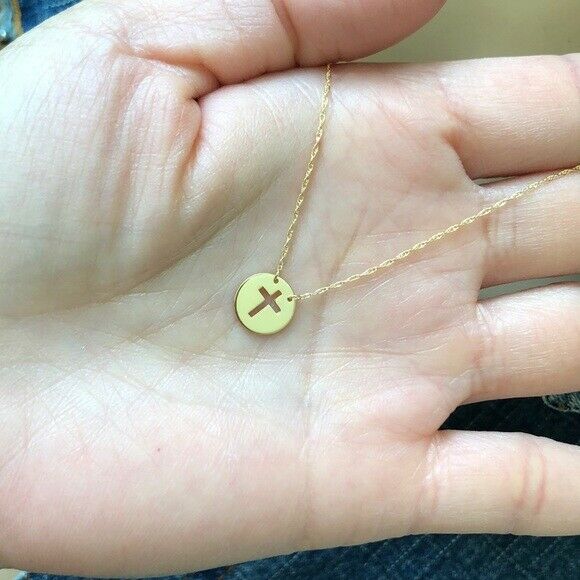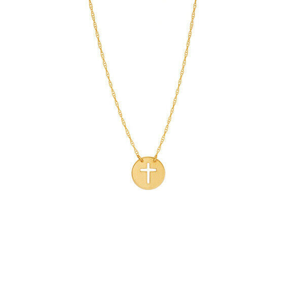 14K Solid White Gold Mini Disk Cut Out Cross Dainty Necklace - Minimalist