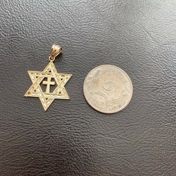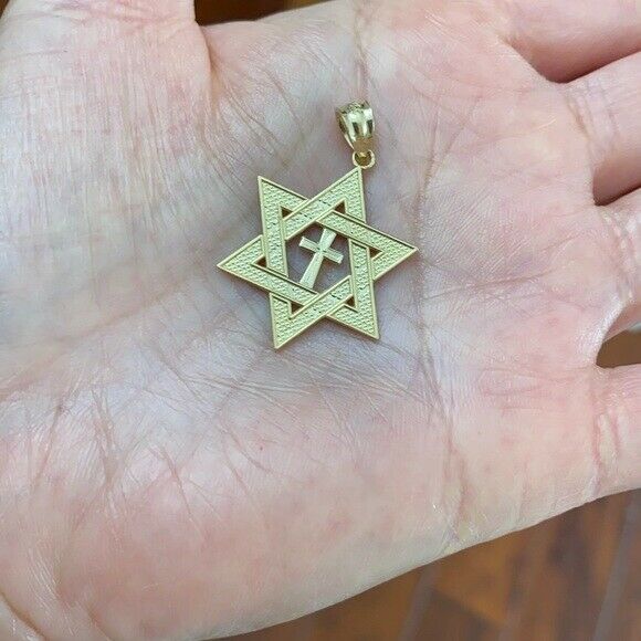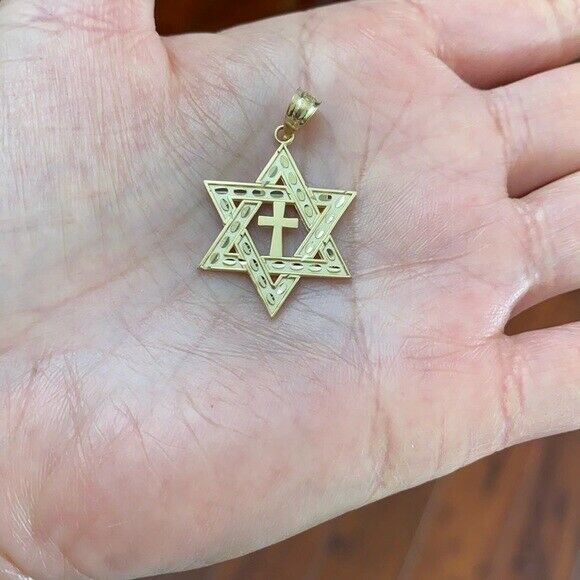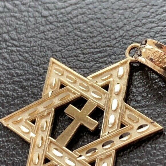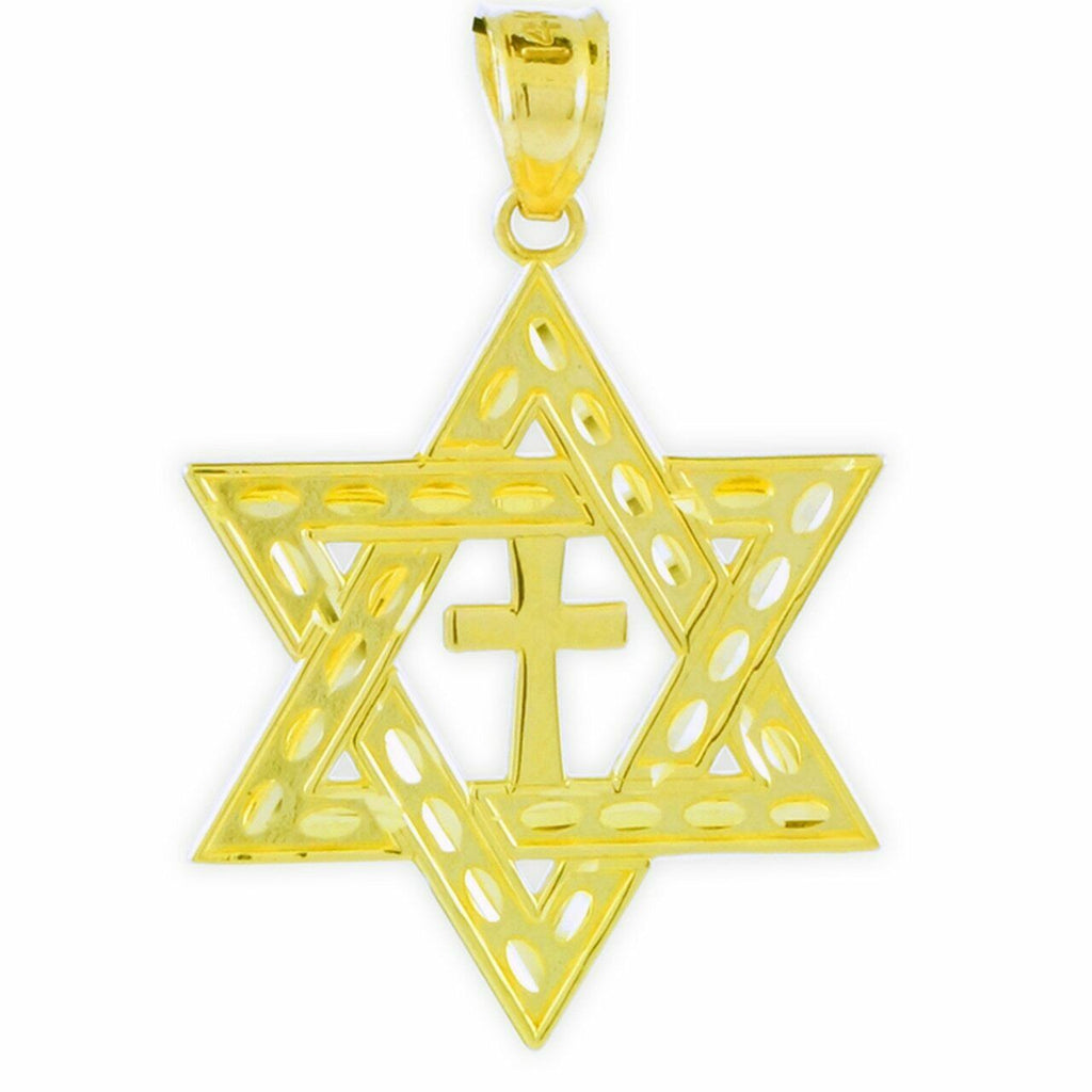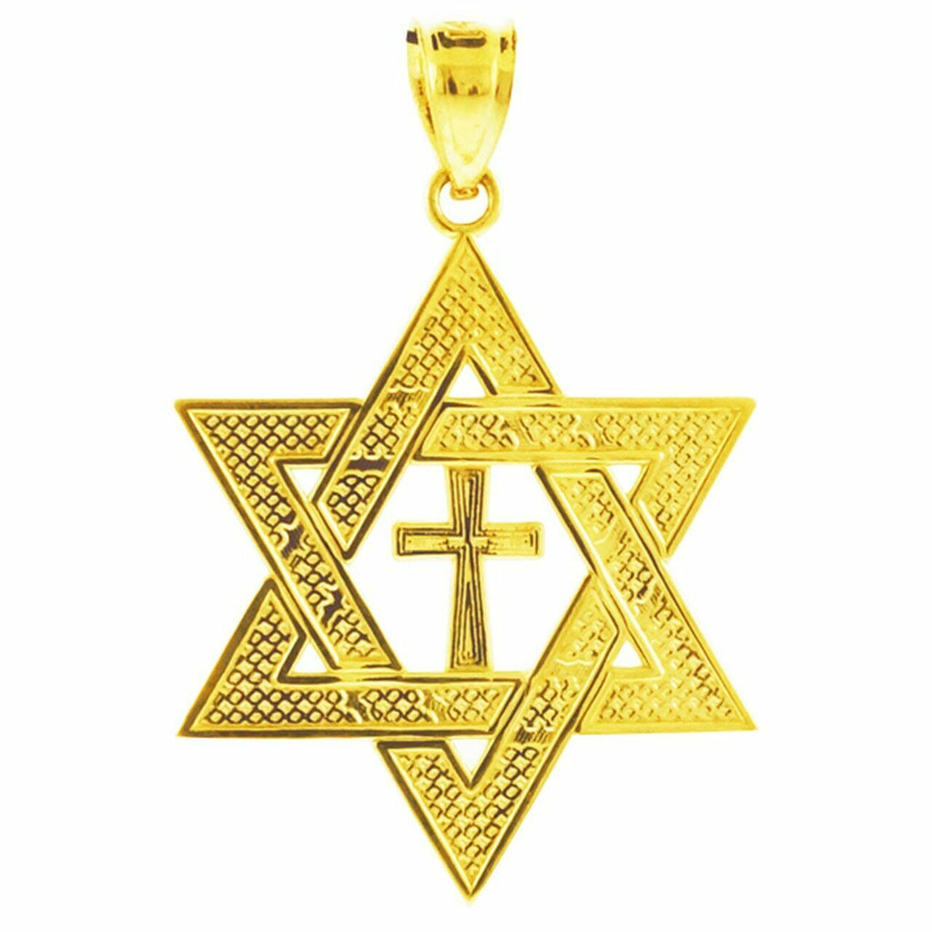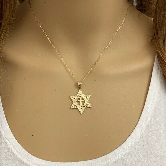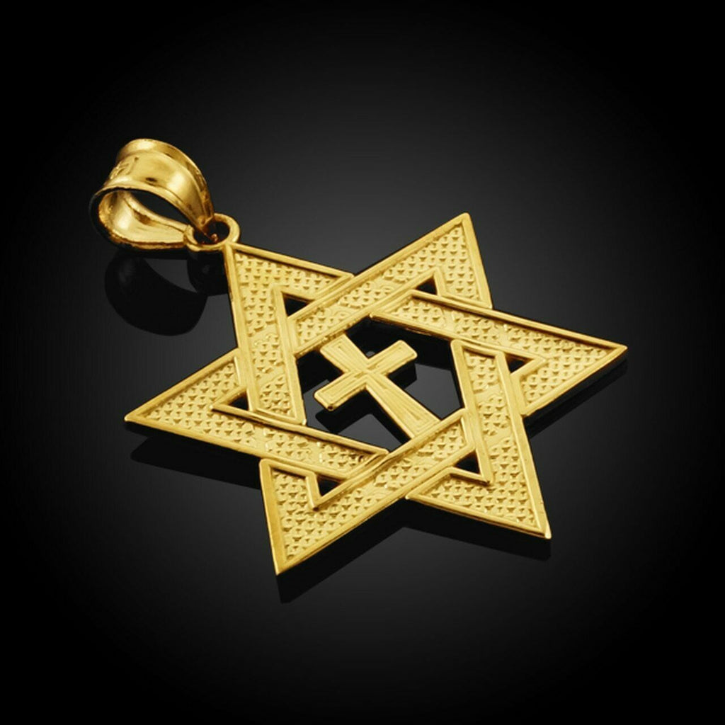 Solid 14k Yellow Gold Jewish Star of David Cross Pendant Necklace Medium 1.25"